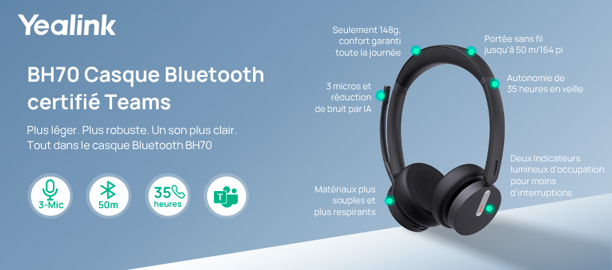 Le Yealink BH70 est un casque sans fil Bluetooth qui redéfinit l'expérience audio pour les utilisateurs modernes. Conçu spécifiquement pour les environnements de bureau et les centres d'appels, ce casque offre une qualité sonore exceptionnelle et un confort prolongé, parfait pour des journées de travail intensives.